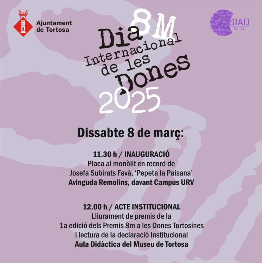 A més del lliurament de premis, l’acte institucional del 8M inclourà la lectura del manifest institucional, l’Escola Municipal de Teatre oferirà un clip teatral i es tancarà l’acte amb l’espectacle ‘Sanguinària’ de la ballarina i coreògrafa Verònica Hernàndez, una peça de dansa inspirada en l’Ordre de l’Atxa de les dones tortosines. Prèviament, a aquest acte, a les 11.30, s’inaugurarà una placa al monòlit en homenatge a Josefa Subirats Favà ‘Pepeta la Paisana’, una dona molt representativa i admirada, coneguda pels seus dots en la cura de gràcia. Un monòlit que està situat just al davant del campus de la URV, al barri de Remolins.