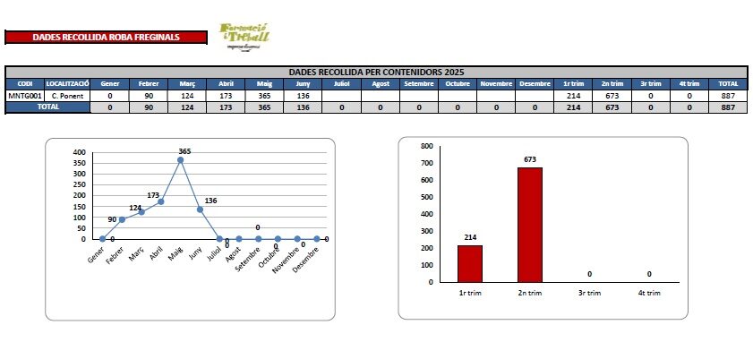 L’Ajuntament de Freginals en col·laboració amb Formació i Treball ha recollit 887 kg de roba de segona mà durant el primer semestre del 2025 a través del contenidor distribuït pel municipi. Aquests quilos se sumen als 3.649.000 kg que l’entitat social ha recollit a Catalunya durant els primers sis mesos del 2025. La roba recollida s’envia a la planta de tractament de Sabadell, una de les més grans i avançades d’Europa, on es classifica per ser reutilitzada o bé es prepara per al seu reciclatge. Un 62% del tèxtil s’aprofita per a la venda solidària o Programes d’Entrega Social a través de les botigues Moda re-, així com per exportació internacional, per la seva alta capacitat d’acceptació de la roba de segona mà”.