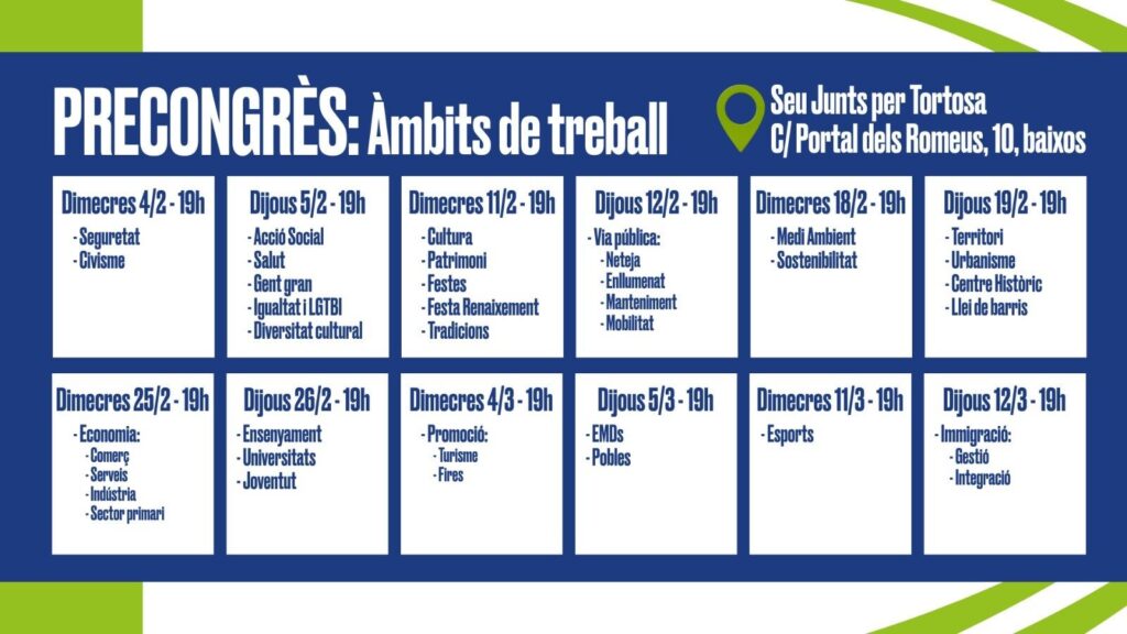 Junts per Tortosa ha fet públic el calendari de les jornades de treball sectorials que es duran a terme durant els mesos de febrer i març, en el marc del procés previ al 2n Congrés del partit, que se celebrarà el dissabte 21 de març. Es tracta d’unes sessions obertes a la ciutadania amb l’objectiu d’escoltar, debatre i actualitzar el projecte de ciutat de cara al 2027.
